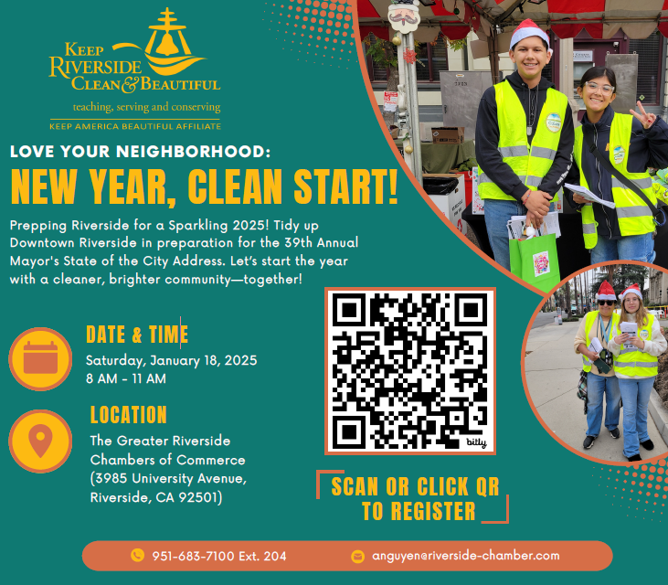 Keep Riverside Clean and Beautiful (KRCB) is collaborating with UCR MLK Day of Service 2025 to recruit volunteers to clean up surrounding neighborhoods.